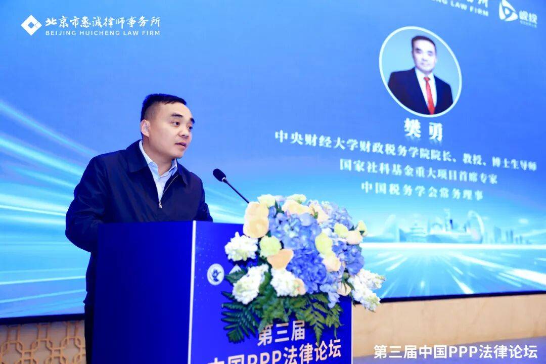 中央财经大学财政税务学院樊勇院长代表主办方致辞。他首先对与会嘉宾表示热烈欢迎,并对承办方北京市惠诚律师事务所的周密筹备表示感谢。樊院长强调,中央财经大学作为我国财经领域的重要人才培养和科学研究基地,始终站在国家财经政策研究和实践探索的前沿。未来,学校将继续发挥学科优势,搭建更高水平的交流平台,推动PPP理论研究与实务操作的深度融合。