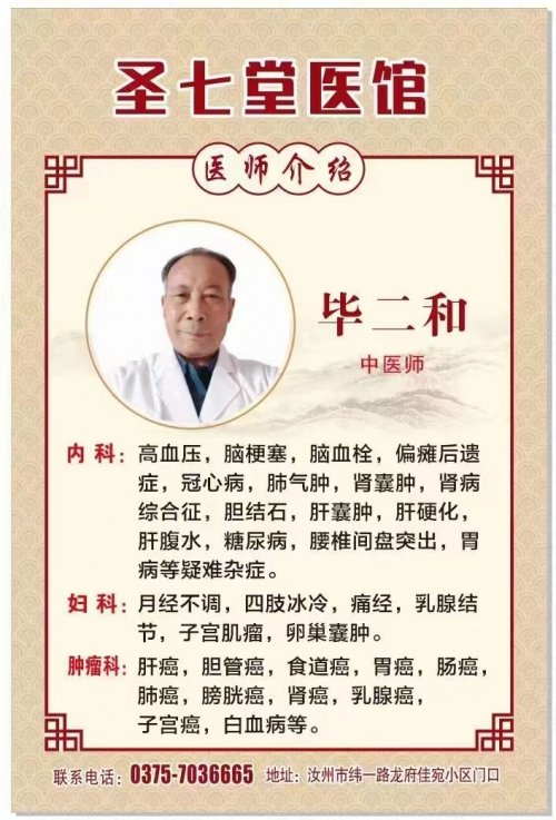毕二和,男,69岁,从事中医40余年。1979年夏在纸坊卫生院跟随桂全朝中医师学习中医。1980年冬,前往汝州市中医院深造,拜祖传名医副主任中医师郑继卿名下为徒4年,期间曾任中药组组长。1983年春,卫生部中医司司长带队河南省卫生厅数十位领导莅临汝州市中医院检查验收工作,院领导命我代替中药师汇报工作,得到了高度赞赏。84年从母院返里,考取中医师证,自理开设德仁中医诊所。1993年4月,出席国家科委组织召开的学术会议,发表论文“运用神经消癌散.治疗消化道癌症”。1995年考取乡村中医师证,同年受聘于寄料卫生院任业务长。2017年11月10日在北京注册了北京万舜祥中医药研究院。