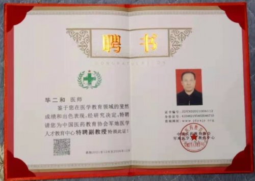 毕二和酷爱中医,热爱生命,面对世界医学难题,作为发誓救民间疾苦的医生不能为疑难病患者解除病痛,看到被病痛折磨的患者祈求的眼神,惭愧直至。视病人如亲人,视病魔为教课书,带着难题攻读医学典籍,刻苦钻研医理;特殊药品自己上山寻地道药材,探索创新出部分中药炮制新方法;探索出很多治疗疑难病的独到方药,癌症、糖尿病、心脑血管病等。尤其治疗癌症,根据癌症是由于“正气亏损,代谢障碍,毒素结聚,形成肿瘤的全身性病变在局部的集中表现”的特点。采取:培补正气法、软坚化积法、细胞代谢排毒法、细胞免疫排毒法等。 “消癌攻坚丸”培补正气、软坚化积、消癌止痛, “益寿丹”益肠胃抗肿瘤,调节脾胃升降功能,保持机体动态平衡; “蔬果疗法”是用新鲜蔬果汁纠正癌症的酸性体质的“细胞免疫排毒法”和市面销售的祥和清进行“细胞代谢排毒法”。四法合用,快速控制疾病,5--7 天各项阳性指标明显下降,自觉症状迅速改善,短期内恶性肿瘤明显缩小,直至痊愈,且根治。